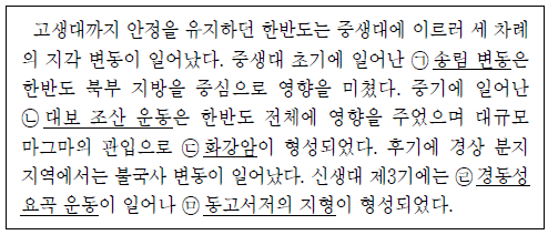 다음 글은 한반도의 지각 운동에 대한 것이다. (ㄱ)~(ㅁ)에 대한 설명 으로 옳지 않은 것은? [3점]
