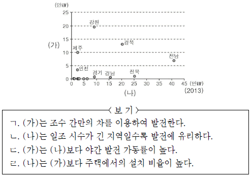 그래프는 (가), (나) 신ㆍ재생 에너지의 지역별 발전 설비 용량을 나타낸 것이다. 이에 대한 옳은 설명만을 <보기>에서 있는 대로 고른 것은? (단, 조력, 풍력, 태양광만 고려함.) [3점]
