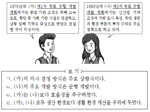 다음은 국토 종합 개발 계획에 관한 대화 내용이다. (가), (나)에 대한 옳은 설명을 <보기>에서 고른 것은?