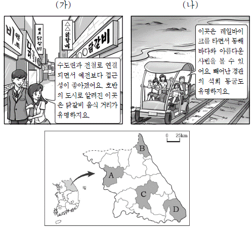 (가), (나)에 해당하는 지역을 지도의 A~D에서 고른 것은? [3점](순서대로 가, 나)