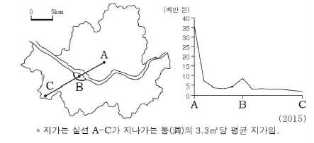 다음 자료는 서울시 도시 내부의 지가를 나타낸 것이다. A~C지역에 대한 추론으로 가장 적절한 것은?