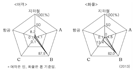 그래프는 교통수단별 국내 수송 분담률을 나타낸 것이다. A ∼ C 교통수단에 대한 설명으로 옳은 것은? [3점]