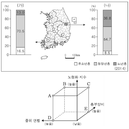 다음 자료는 (가), (나)지역의 인구 구조를 나타낸 것이다. (가)지역과 비교한 (나)지역의 상대적 특성을 그림의 A∼E에서 고른 것은?