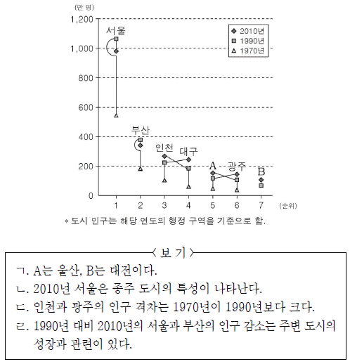 그래프는 인구 규모에 따른 도시 순위 변화를 나타낸 것이다. 이에 대한 옳은 설명을 <보기>에서 고른 것은? (단, A, B는 광역시임.) [3점]
