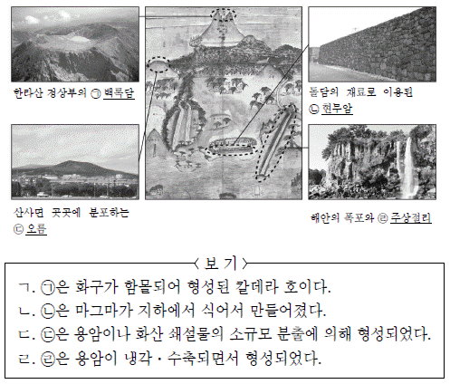 다음 자료는 조선 시대의 산수화에 표현된 경관의 일부를 나타낸 사진이다. (ㄱ)∼(ㄹ)에 대한 옳은 설명을 <보기>에서 고른 것은? [3점]