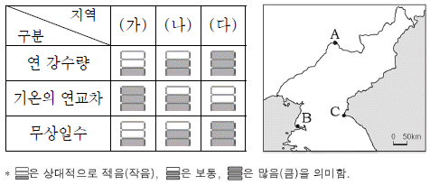 표는 (가) ~ (다) 지역의 기후 특성을 상대적으로 나타낸 것이다. 이에 해당하는 지역을 지도의 A~ C에서 고른 것은? (순서대로 가, 나, 다) [3점]