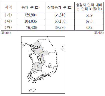 표의 (가)~(다)에 해당하는 지역을 지도의 A~C에서 고른 것은? (순서대로 가, 나, 다)