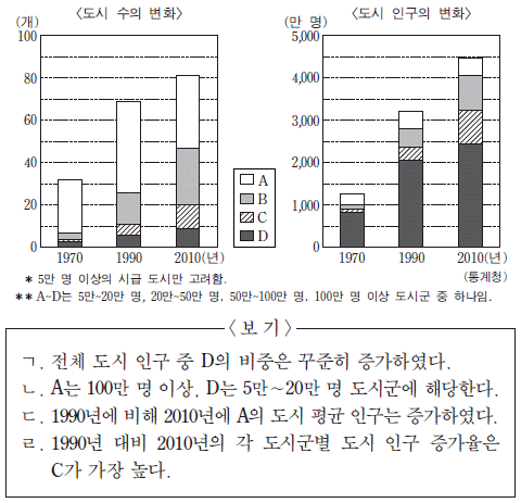그래프는 우리나라의 도시 수와 도시 인구의 변화를 인구 규모별로 나타낸 것이다. 이에 대한 옳은 분석을 <보기>에서 고른 것은? [3점]