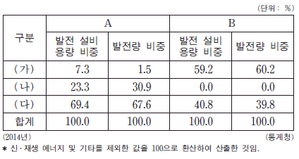 표는 남한과 북한의 발전 현황을 나타낸 것이다. 이에 대한 설명으로 옳은 것은? (단, A와 B는 남한과 북한 중 하나이며, (가)~(다)는 수력, 원자력, 화력 중 하나임.)