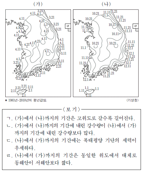 (가), (나)에 대한 옳은 설명을 <보기>에서 고른 것은? (단, (가), (나)는 서리 내린 첫날 과 서리 내린 마지막 날 중 하나임.)