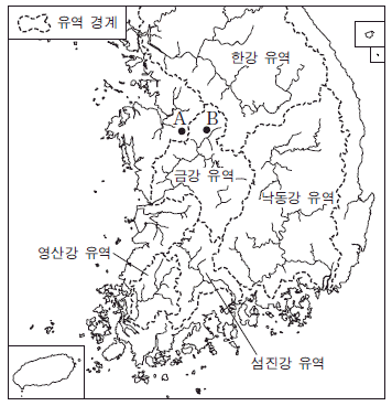 지도는 우리나라 주요 하천 유역에 관한 것이다. 이에 대한 설명으로 옳은 것은? [3점]