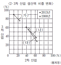 그래프는 서울시의 구(區)별 특성을 나타낸 것이다. (가)~(다)에 해당하는 지역을 A~C에서 고른 것은? (순서대로 가, 나, 다)