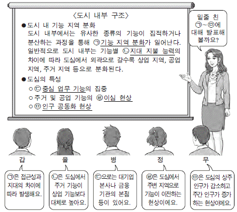 [과목 구분 없음] 다음은 도시 단원에 대한 한국 지리 수업 장면이다. 발표 내용이 옳지 않은 학생을 고른 것은?