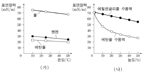 그림 (가)는 온도에 따른 여러 가지 물질의 표면장력을, 그림 (나)는 25℃에서 농도에 따른 에탄올 수용액과 에틸렌글리콜 수용액의 표면장력을 나타낸 것이다.