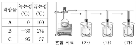 표는 서로 반응하지 않는 어떤 화합물의 물리적 특성을 나타낸 것이고, 그림은 혼합물을 분리하는 장치를 나타낸 것이다.