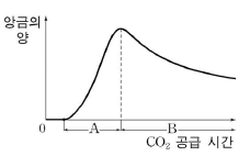 석회수가 들어 있는 시험관에 이산화탄소를 일정량으로 계속 공급하였더니, 시험관 안의 앙금의 양이 그림과 같이 나타났다.