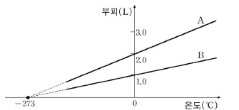 그림은 일정한 압력에서 온도에 따른 기체 A와 B의 부피를 나타낸 것이다.