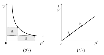 그림은 일정한 온도에서 기체의 압력(P)과 부피(V)의 관계를 나타낸 것이다. (단, 기체의 질량은 일정하다.)