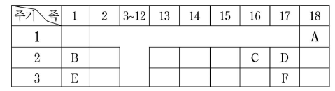 다음은 주기율표의 일부를 나타낸 것이다. 원소 A~F와 관련된 설명으로 옳지 않은 것은? (단, A~F는 임의의 원소 기호이다.) [3점]