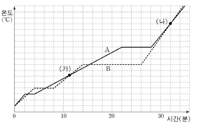 그림은 고체 상태인 물질 A와 B를 단위 시간당 일정한 열량으로 가열할 때, 시간에 따른 온도를 나타낸 것이다. (단, 물질 A와 B의 질량은 같다.)