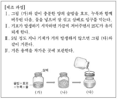 다음은 곡물을 발효시켜 전통주를 만드는 과정이다.