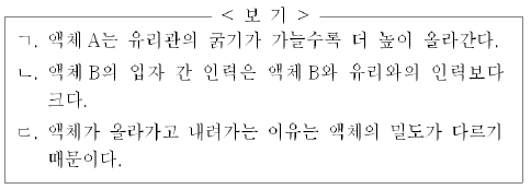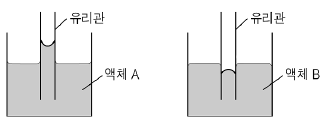 그림은 액체 A와 B가 든 비커의 굵기가 같은 유리관을 각각 세웠을 때의 모습을 나타낸 것이다.