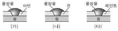 그림 (가)~(다)는 표면이 각각 다르게 처리된 철에 흠집이 생긴 후 물방울이 접촉된 것을 나타낸 것이다.