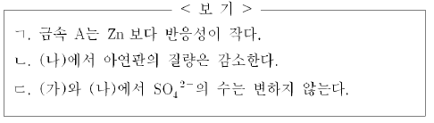 (가)에서 아연판 표면에 금속 A가 석출되었다면, (가)와 (나)에 대한 설명으로 옳은 것을 <보기>에서 모두 고른 것은? (단, A는 임의의 원소 기호이다. ) [3점]