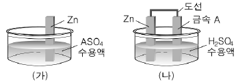 그림 (가)는 아연관을 ASO4수용액에 넣은 것을 그림 (나)는 아연과 금속 A를 도선으로 연결하여 H2SO4수용액에 넣은 것을 나타낸 것이다.