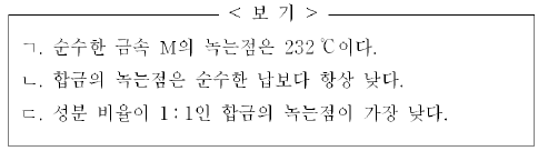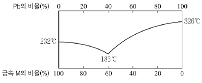 그림은 납(PB)과 금속 M을 혼합하여 만든 합금의 성분 비율에 따른 녹는점을 나타낸 것이다.