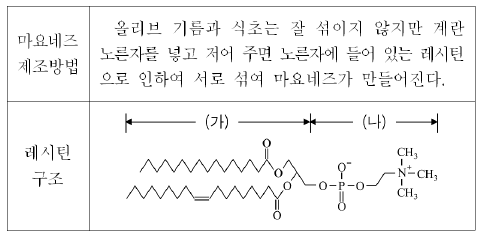 자료는 마요네즈의 제조 방법과 레시핀의 구조를 나타낸 것이다.