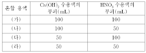표는 온도가 같은 Ca(OH)2 수용액과 HNO3 수용액을 부피를 달리하여 혼합한 것을 나타낸 것이다. (단, Ca(OH)2 수용액 10mL를 완전히 중화하는데 필요한 HNO3 수용액은 10mL이다.