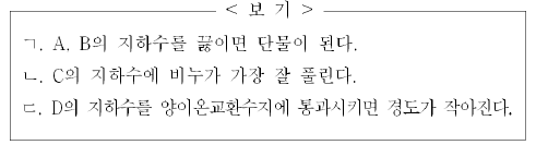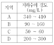 표는 A~D지역의 지하수의 경도를 나타낸 것이다. (단, 경도는 물 속에 존재하는 칼슘 이온과 마그네슘 이온의 함량을 CaCO3의 양으로 환산하여 나타낸 것으로 그 값이 75mg/L이하이면 단물이라고 한다)