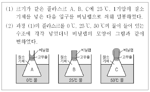 그림과 같이 무거운 추를 매단 풍선을 물이 들어 있는 비커에 넣고 가열하였더니 풍선의 부피가 점점 커졌다.