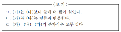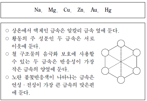 영희는 다음과 같은 6개의 금속을 설명에 따라 그림에 배치하였다.