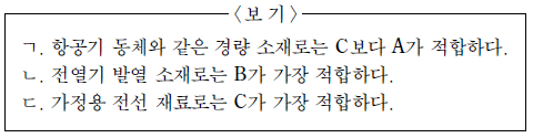 그림은 실생활에서 사용되고 있는 세 가지 금속 소재 A~C의 특성을 나타낸 것이다.