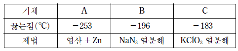표는 어떤 기체 A~C의 끓는점과 제법을 나타낸 것이다.