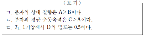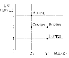 그림은 어떤 기체 A~D의 밀도를 나타낸 것이다. 기체 A와 B는 1기압, 기체 C와 D는 2기압이며, 온도 T2는 T1의 2배이다.