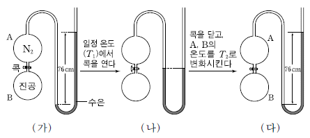 그림은 용기 A, B가 연결된 U자관을 이용하여 기체의 성질을 알아보는 실험을 나타낸 것이다.