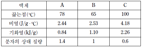 표는 세 가지 액체 A~C의 물리적 성질을 나타낸 것이다.