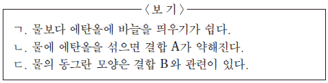 그림 (가)는 폴리에틸렌판 위에 떨어뜨린 물과 에탄올의 방울 모양을, (나)는 물 분자의 결합 모형을 나타낸 것이다.