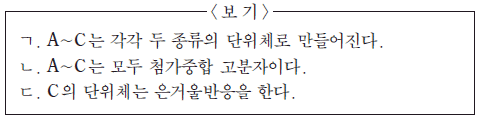 그림은 세 가지 고분자 화합물의 구조식을 나타낸 것이다.