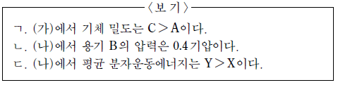이 실험에 대한 설명으로 옳은 것만을 <보기>에서 있는 대로 고른 것은? (단, X와 Y는 반응하지 않으며, 피스톤의 마찰은 없다.) [3점]