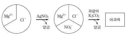 그림은 묽은 염화마그네슘(MgCl2) 수용액을 질산은(AgNO3), 탄산칼륨(K2CO3)과 차례로 반응시켰을 때, 용액에 들어 있는 이온의 종류와 비율을 원그래프로 나타낸 것이다.