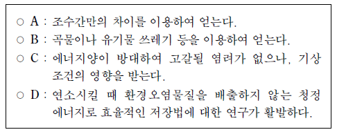 다음은 신재생에너지 A~D에 관한 설명이다.