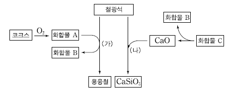 그림은 철의 제련과정에서 일어나는 화학반응을 나타낸 것이다.