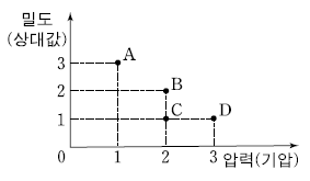 그림은 일정한 질량의 헬륨 기체에 대한 압력과 밀도를 나타낸 것이다.