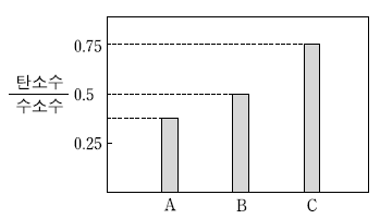 그림은 탄소수가 세 개인 사슬모양 탄화수소 A, B, C의