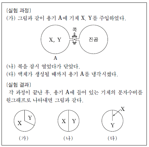 실험 결과에서 X 가 Y 보다 큰 물리량만을 <보기>에서 있는 대로 고른 것은? (단, 기체 X, Y는 반응하지 않는다.)