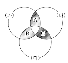 기준 (가)~(다)에 속하는 화합물을 벤다이어그램으로 나타낼 때, 빗금 친 부분 A, B, C에 들어갈 화합물의 수로 옳은 것은? (순서대로 A, B, C) [3점]